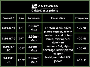 The EM-1317 Series are cables in 6, 10 or 25ft with 2.92mm male to 2.92mm male connectors on both ends. These are low-loss, high-performance, which covers the frequency range from DC to 40GHZ. These are ruggedized and armored for durability and stability.